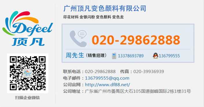 點(diǎn)擊:在廣州購(gòu)買(mǎi)夜光粉、溫變粉、光變粉、反光粉、珠光粉等各種變色顏料哪里比較好呢?買(mǎi)變色顏料就到廣州頂凡變色顏料有限公司,頂凡經(jīng)營(yíng)的產(chǎn)品中了齊全,夜光粉、熒光粉、銅金粉、珠光變色龍顏料、反光粉、溫變粉、光變粉都可以在頂凡買(mǎi)到。頂凡不僅有實(shí)體店,而且在阿里巴巴、淘寶等電商平臺(tái)都可以買(mǎi)到我們的產(chǎn)品。公司官網(wǎng):www.df88.net