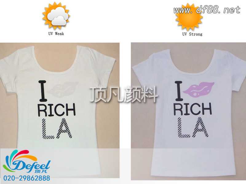 市面上變色T恤分為兩種,一種是隨著溫度的變化而發生顏色的改變,另外一種是隨著光的照射而變化。這兩種變色的方式是不一樣的,主要是因為產生顏色變化的原材料不一樣。